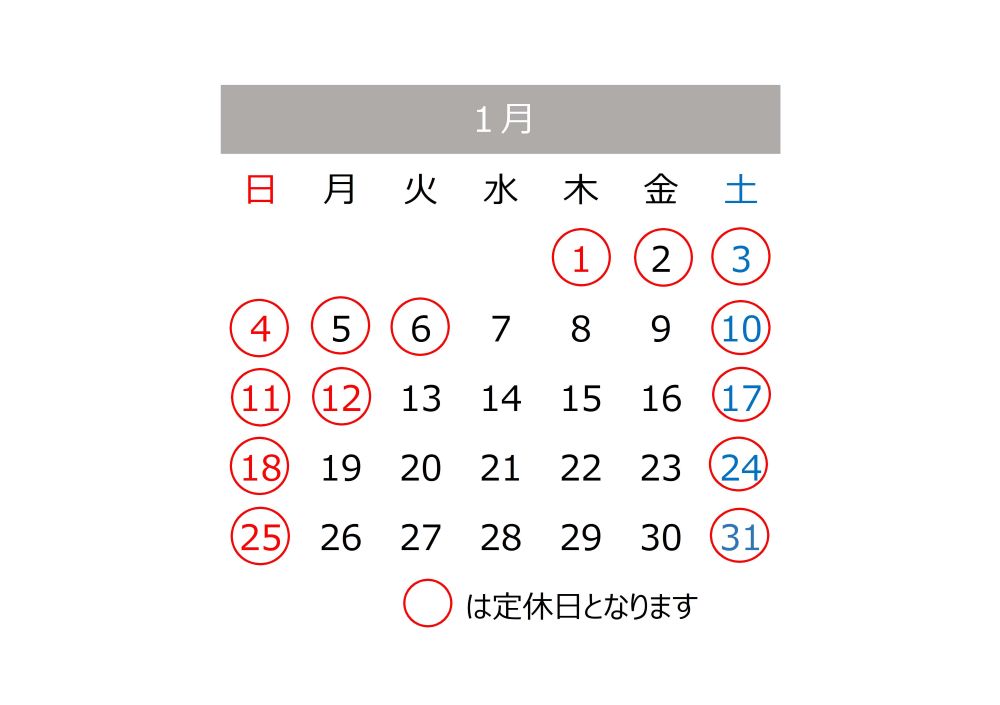 1月定休日のお知らせ 2025.12.24 いつもご利用いただきありがとうございます。 1月の定休日をお知らせ致します。 本年も沢山のお問い合わせをいただきありがとうございました。来年もご来店お待ちしております♪ 戻る